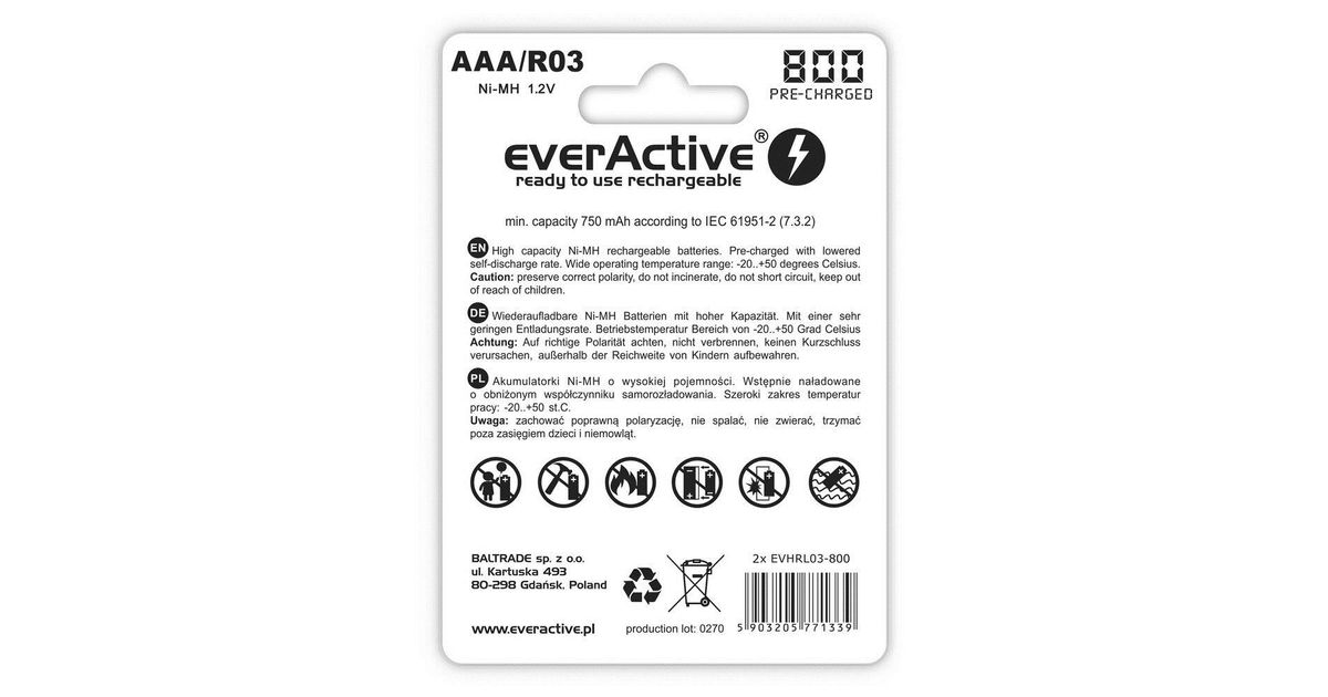 Everactive EVHRL03-800, Rechargeable battery, AAA, Nickel-Metal Hydride (NiMH), 1.2 V, 4 pc(s), 800 mAh