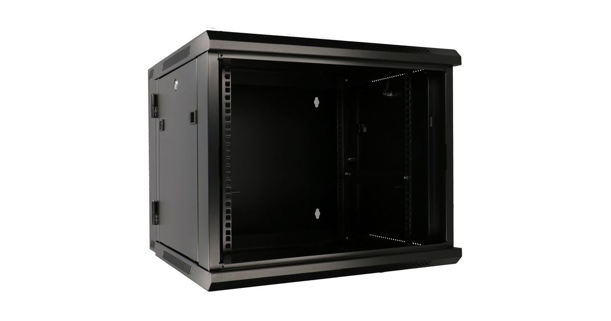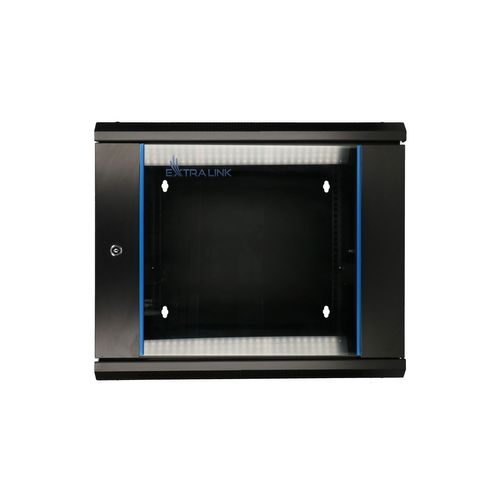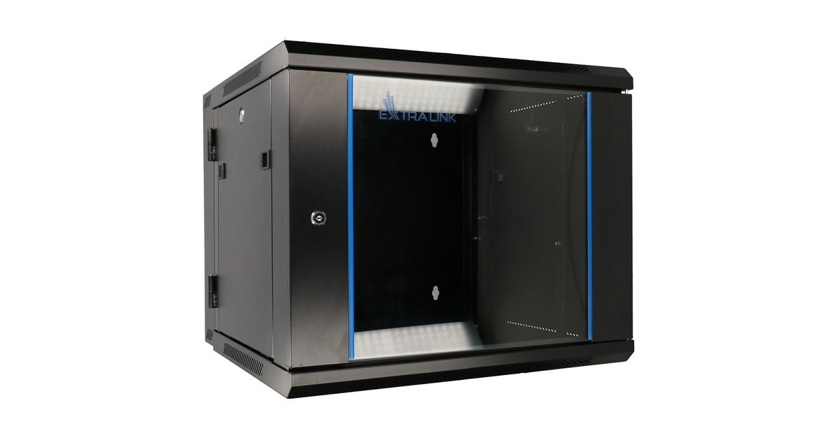 The Extralink rack cabinet is designed for wall mounting in offices, network server rooms and CCTV control rooms. The external walls are made of cold-rolled steel sheet, while the front door has a tempered glass pane with the possibility of opening to the left or right side. Two-section construction facilitates access to the installed components from the back.