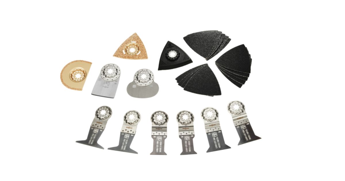 Accessory kit containing 26 parts for upcoming renovation work. Suitable for all FEIN MultiTools and all other common MultiTools with Starlock mounting. Available as a set, offering significant savings over purchasing the items individually. Content: 6 E-Cut long-life saw blades (2 each of 50 x 35 mm, 50 x 50 mm, 50 x 65 mm), 1 carbide rasp (80 mm), 1 carbide segment saw blade (diameter 75 mm, 2.2 mm), 1 rigid stopper knife, 1 cutter blade, (mushroom-shaped), 1 sanding pad, unperforated (80 mm), sanding sheets (5 each of grit 60, 80, 120).