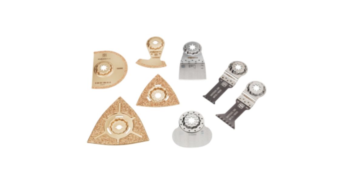 Accessory kit containing 8 parts with extensive range of accessories, especially for key applications in sanitary repairs. Suitable for FEIN MultiTools with StarlockMax mounting and all other common MultiTools with StarlockMax mounting. Available as a set, offering significant savings over purchasing the items individually. Content: 2 E-Cut universal saw blades (60 x 28 mm, 60 x 44 mm), 1 cutter blade (mushroom-shaped), 1 rigid stopper knife, carbide rasp (1 each of 80 mm, 110 mm), 1 carbide segment saw blade (diameter 90 x 2.2 mm), 1 carbide saw blade (2.2 mm).