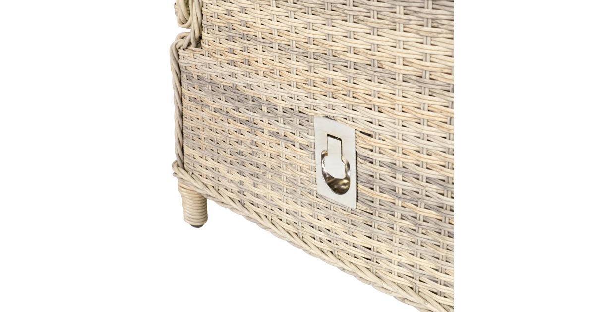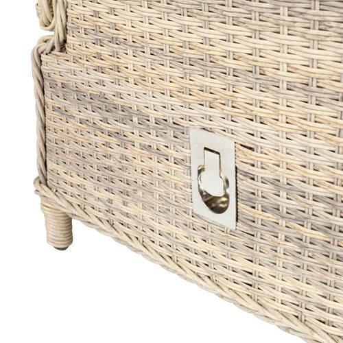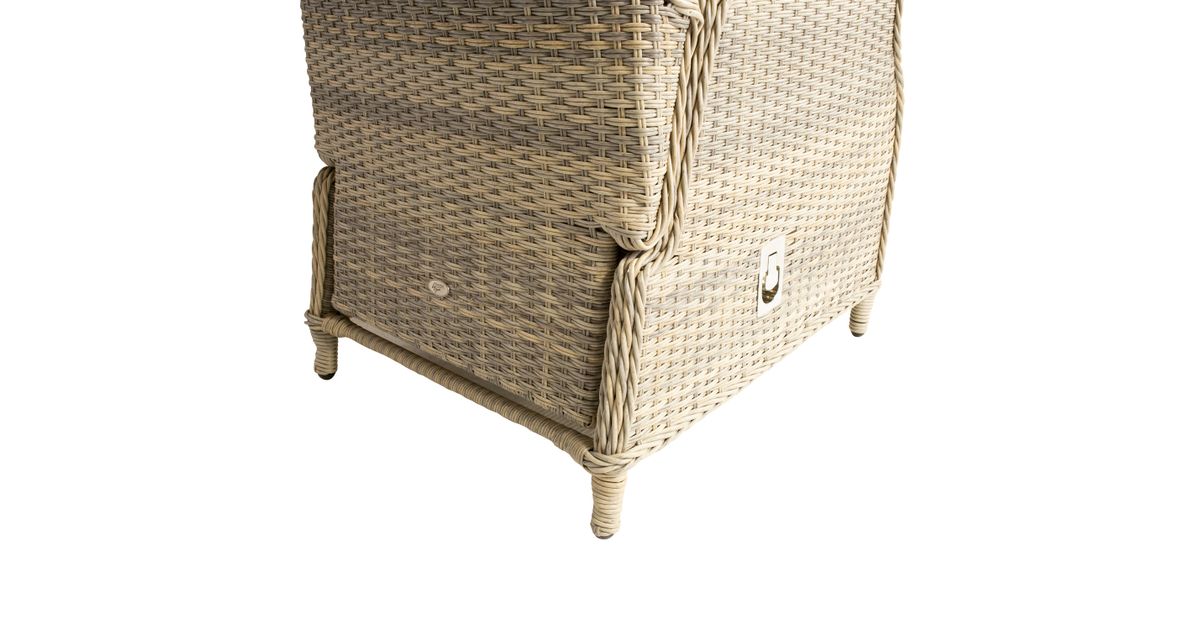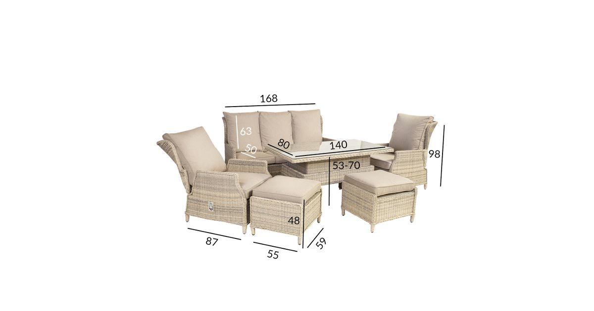 Garden furniture set BASEL height adjustable table, sofa, 2 chairs, and 2 ottomans. The frames of all parts of the set are made of aluminum and covered with beige plastic wicker. The dimensions of the table are 140x80xH48-68cm, tabletop: 5mm transparent tempered glass. The dimensions of the 3-seater sofa are 168x86xH98cm. The backrests of the armchairs are adjustable. The dimensions of the armchair are 64x86xH98cm. The dimensions of the ottoman are 55x60xH45cm. Cushions are included. The cushion covers are made of beige olefin fabric. The product is durable in changing weather conditions and very easy to maintain. Only cushions need protection from the weather. To prolong the life span of outdoor furniture, we recommend using outdoor furniture covers. STORAGE: at the end of the summer season, we recommend storing the garden furniture indoors. Clean and dry the furniture before storing it. Use a dry and well-ventilated room for storage.