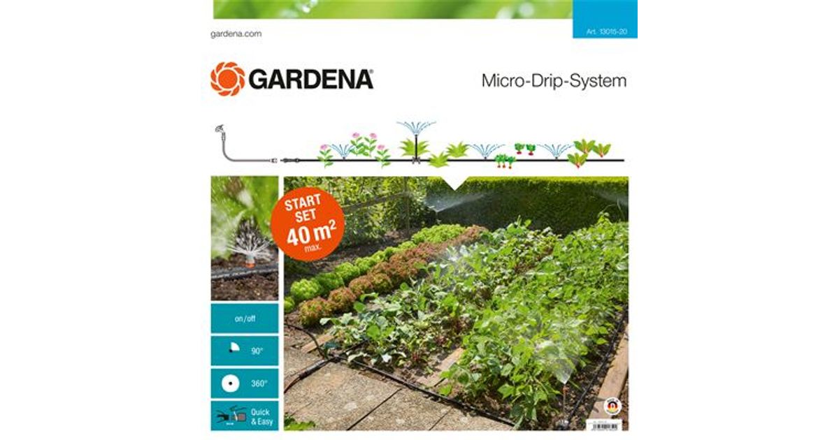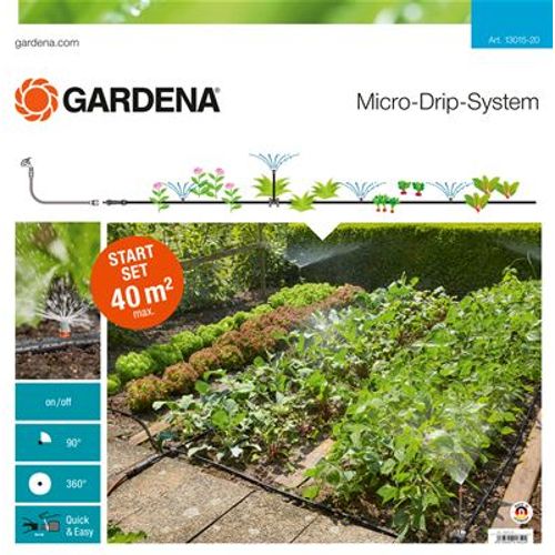 The GARDENA Micro-Drip-System Starter Set Planted Areas is used for the convenient irrigation of flower and vegetable beds, and is ideal for short vegetation periods in vegetable beds. The pressure-reducing Master Unit is connected to the tap with the aid of a hose. The plants are gently watered via the pipe system and the flexibly used Spray Nozzles with differing output angles