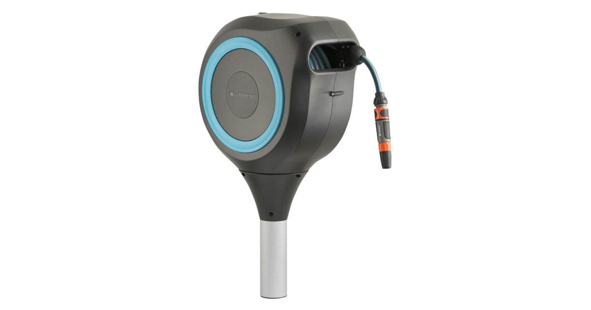 The hose automatically locks into place at the desired length thanks to the practical short locking points. With a light pull, the lock is released and thanks to a spring, the hose is automatically and evenly rolled up. The RollControl technology ensures that the retraction is slow and controlled. The integrated hose guide ensures an even retraction without kinking or knotting the hose.