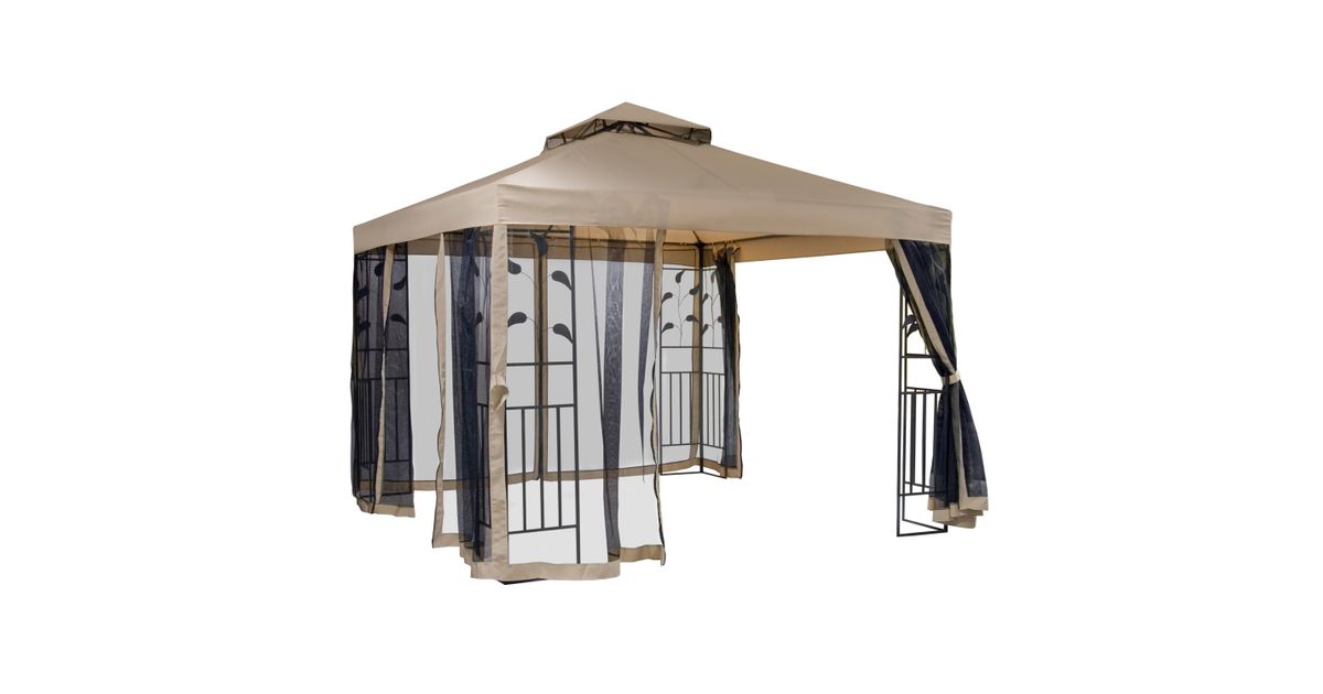 Gazebo LEAF 3x3m beige. The gazebo creates a pleasant shelter to relax. It offers relief from the hot sun and light breeze. The roof is made of beige polyester fabric 180g/m². Black mosquito nets with zippers are also included in the set. The dark brown steel frame is powder coated. WARNING: this gazebo is designed as a temporary structure and should not be left up unattended when strong winds and rain can cause significant damage. The roof and walls are made of materials with very good weather resistance, but they are not waterproof. STORAGE: to prolong the life span of the product, we recommend disassembling it for the winter season and storing it in a dry and well-ventilated room. Clean and dry the roof and side walls before storing.