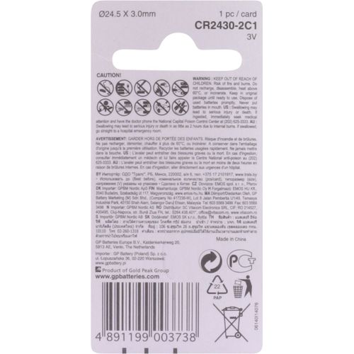 GP Batteries Lithium Cell Lithium CR2430 - 1, Single-use battery, Lithium, 3 V, 1 pc(s), Stainless steel, 3 mm