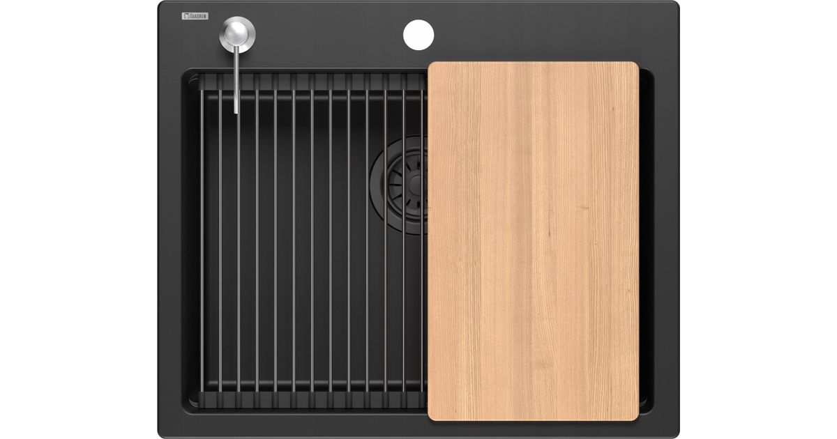 GraniteQ Quadron sink | KURT 110 | kitchen sink BLACK matt granite | dimensions: 59.5 x 50 x 21.5 cm | accessories: siphon, dispenser, board, Qmat | 1-chamber mortise | cabinet base: from 60 cm