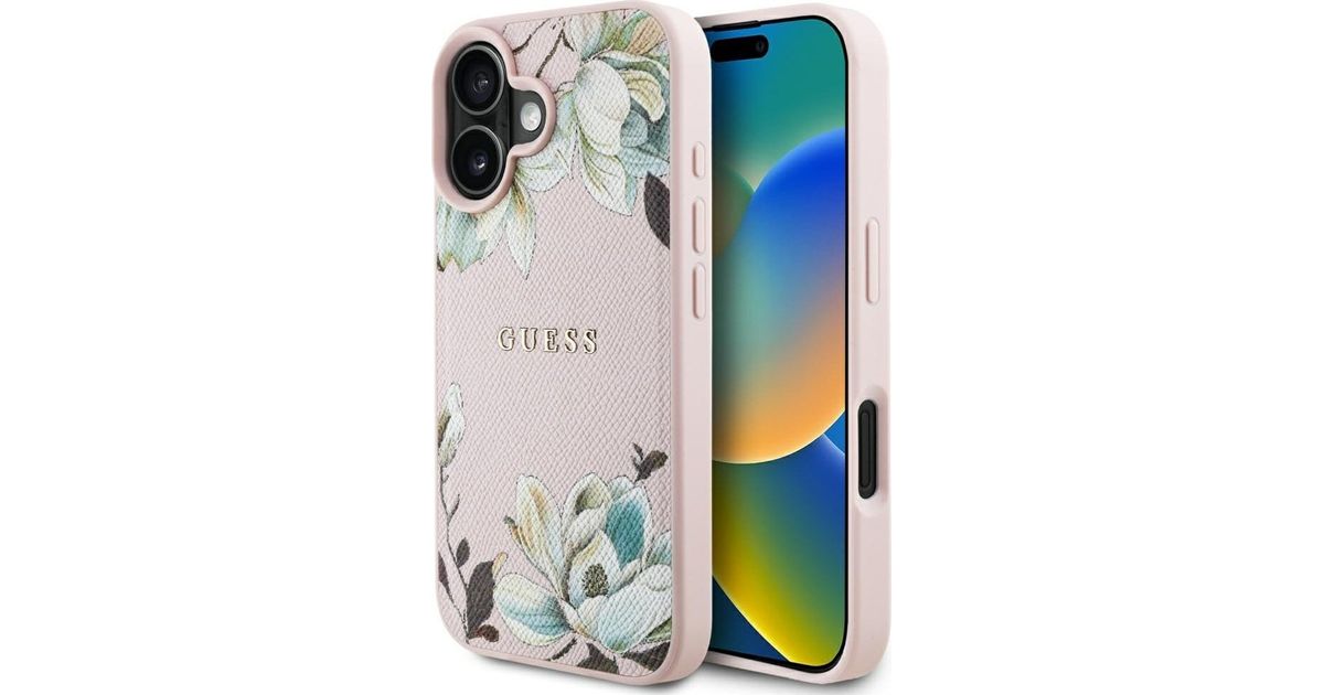 Guess grained printed flower pattern magsafe case for iPhone 16 pink