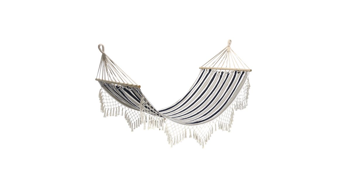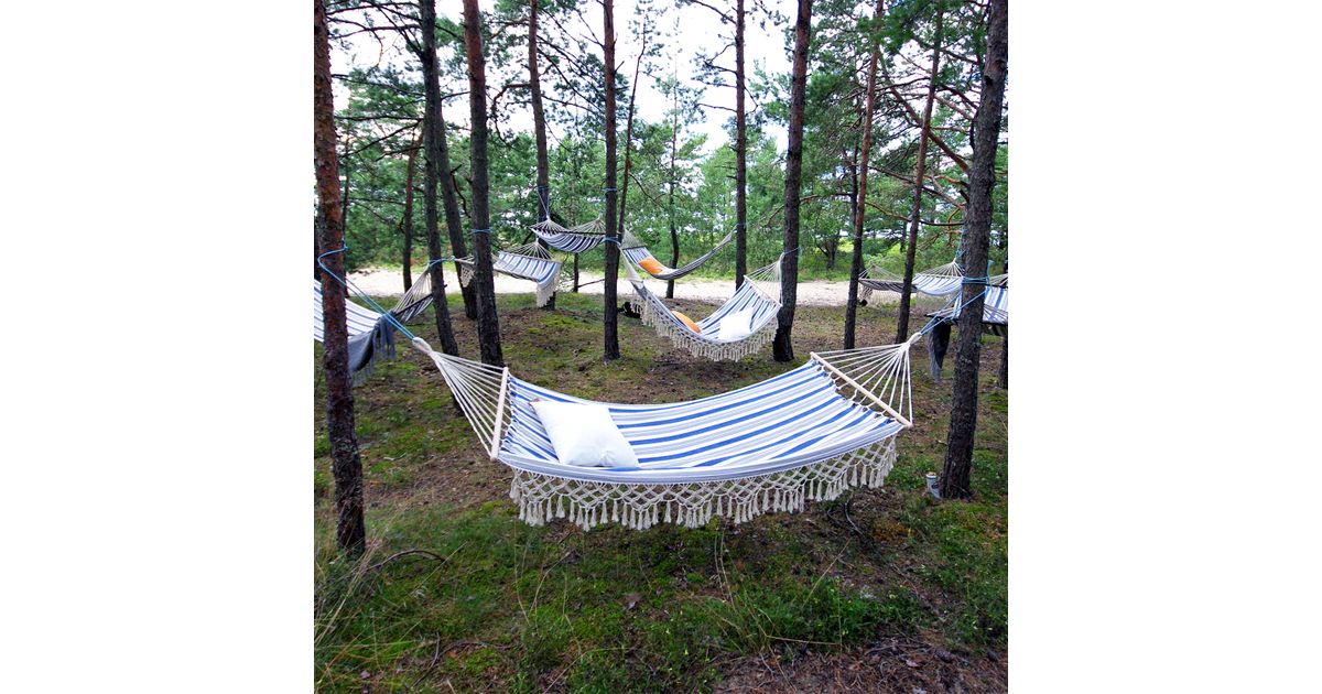 Hammock ROMANCE blue striped. The bed part of the hammock is made of cotton fabric, the edges are decorated with string fringes. The dimensions of the fabric part are 100x190cm, the dimensions of the wooden part are 100x2,5cm. Maximum load capacity 120kg. The swing can be installed between two trees or posts. It is also possible to use a special stand to hang the swing up. The distance between the attachment points must be at least 25-30 cm longer than the total length of the hammock. CARE: to prolong the life span of the product, protect it from the weather. Do not leave the hammock in the sun or rain for a long time. The durability of the fabric and cords decreases due to UV radiation and excessive moisture, and the colors fade. If possible, take the hammock down after use and store it in a dry, well-ventilated room. Allow the hammock to dry completely before storing it. Hand wash is allowed in water up to 40 degrees. Use only mild detergents.
