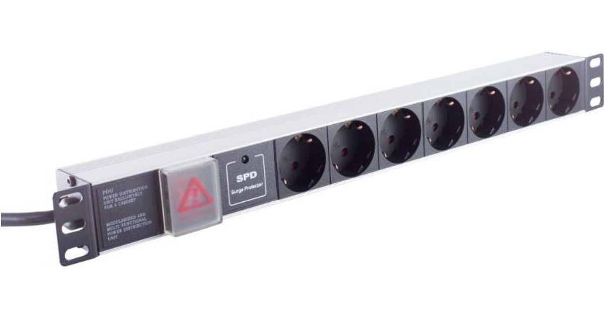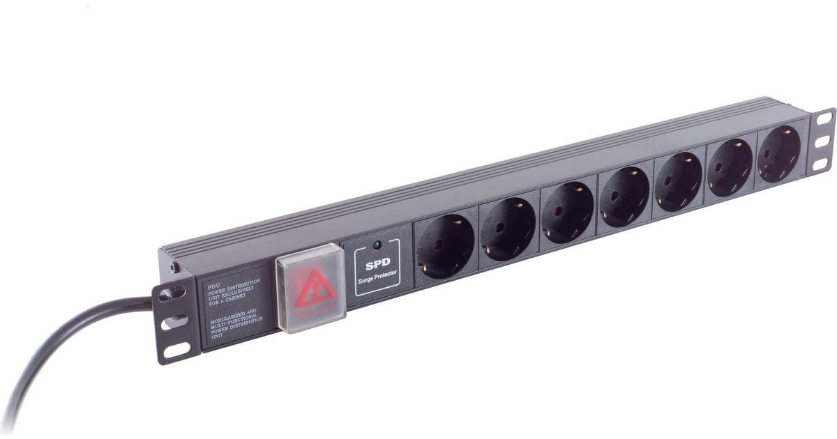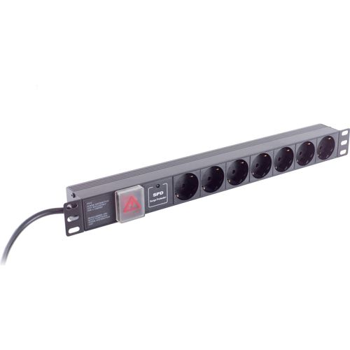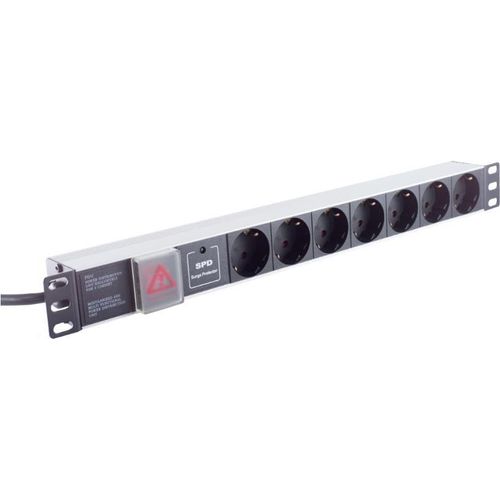 Helos 48,30cm (19") Steckdosenleiste PROFESSIONAL, 7-fach, schwarz, 2,0m, mit Schalter 48,30cm (19") PDU-Leiste für professionelle Anwendungen , 2,0m Zuleitung , 1 HE , mit Überspa