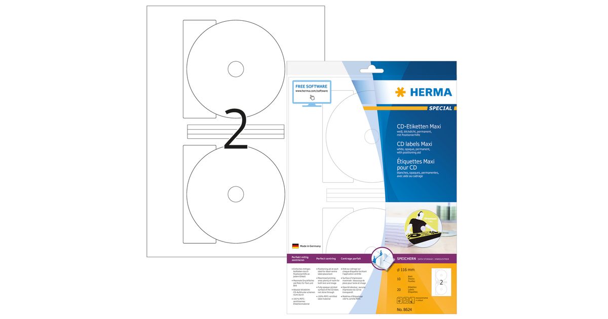 HERMA CD labels Maxi A4 Ø 116 mm white paper matt opaque 20 pcs., White, Self-adhesive printer label, A4, Paper, Laser/Inkjet, Permanent
