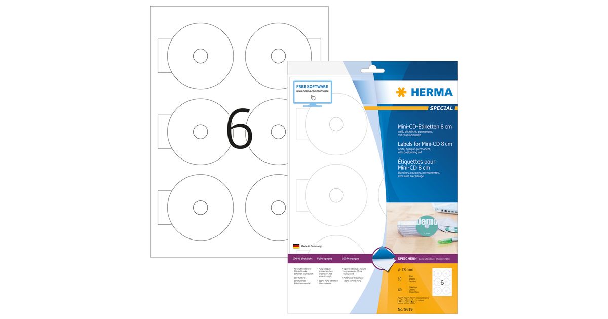 HERMA CD labels Mini A4 Ø 78 mm white paper matt opaque 60 pcs., White, Self-adhesive printer label, A4, Paper, Laser/Inkjet, Permanent
