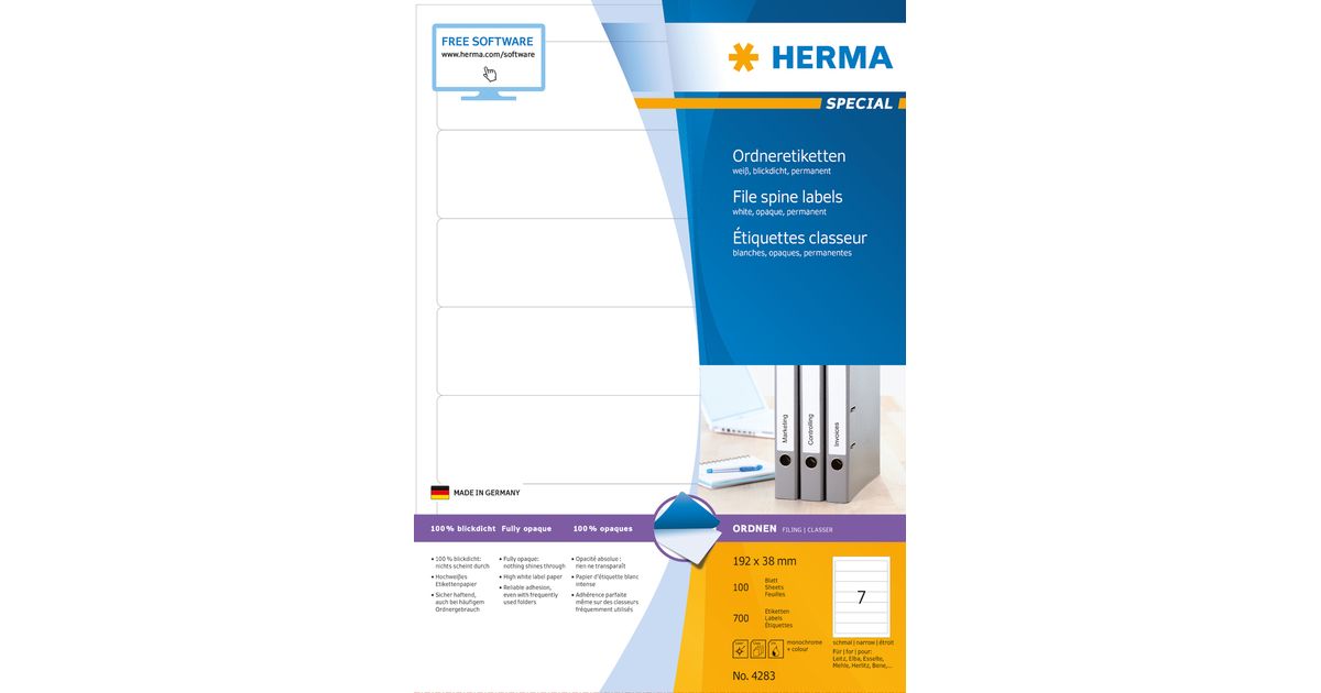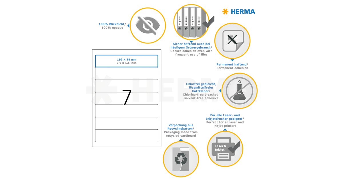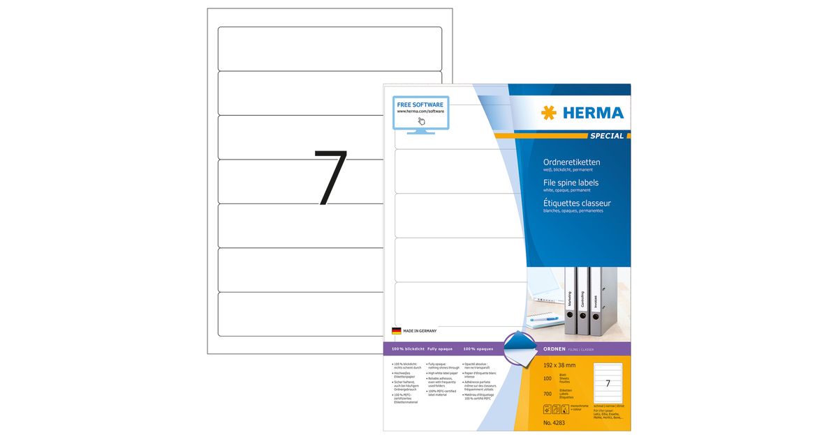 HERMA File labels A4 192x38 mm white paper matt opaque 700 pcs., White, Self-adhesive printer label, A4, Paper, Laser/Inkjet, Permanent