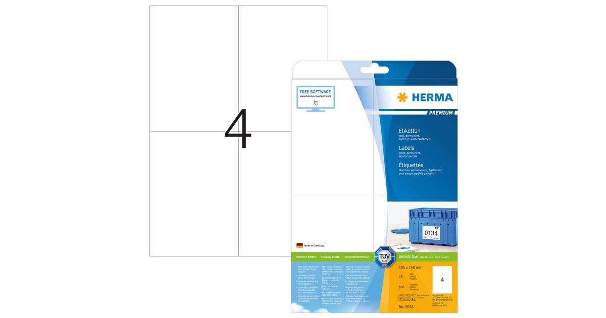 HERMA Labels Premium A4 105x148 mm white paper matt 100 pcs., White, Self-adhesive printer label, A4, Paper, Laser/Inkjet, Permanent