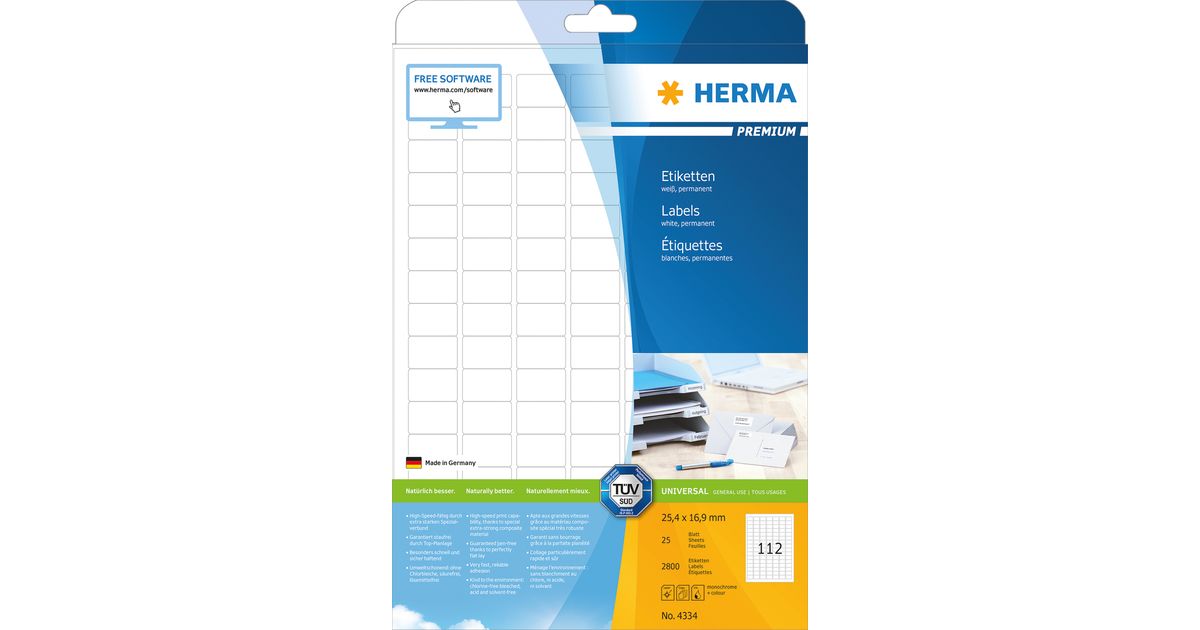 HERMA Labels Premium A4 25.4x16.9 mm white paper matt 2800 pcs., White, Self-adhesive printer label, A4, Paper, Laser/Inkjet, Permanent
