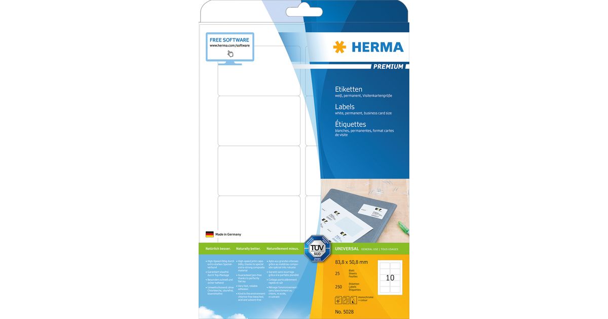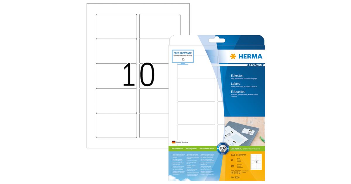 HERMA Labels Premium A4 83.8x50.8 mm white paper matt 250 pcs., White, Self-adhesive printer label, A4, Paper, Laser/Inkjet, Permanent