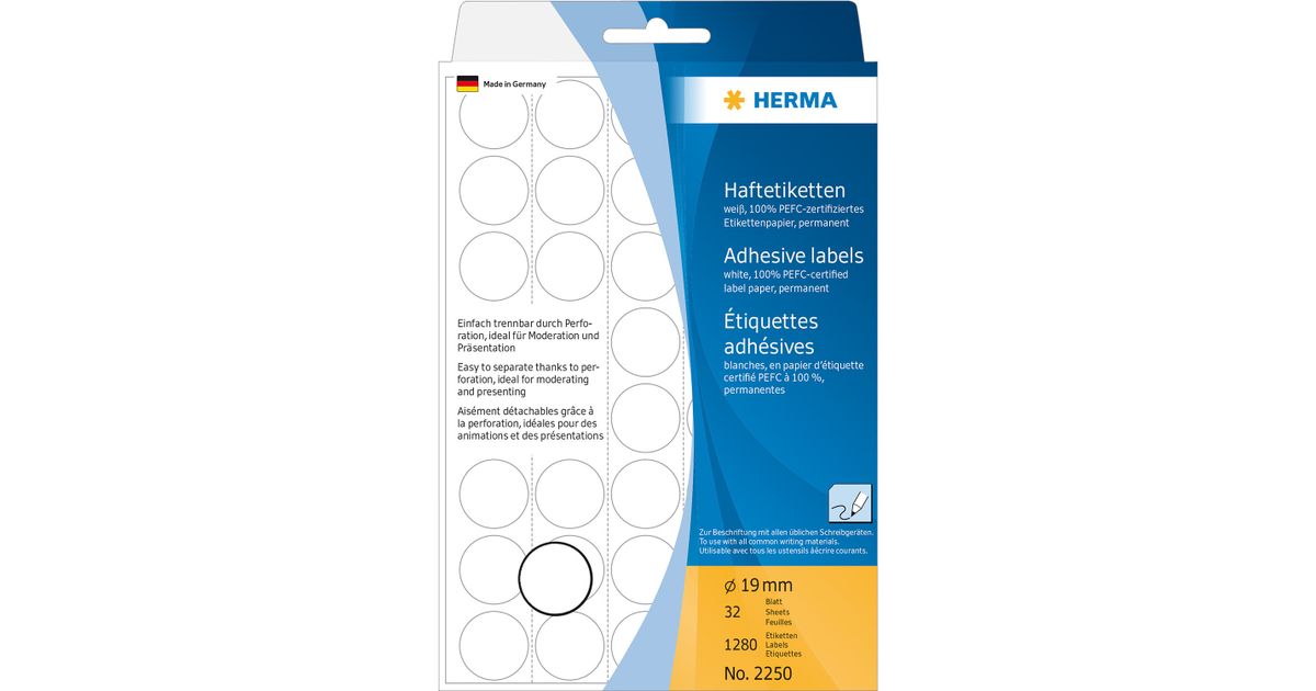HERMA Multi-purpose labels/colour dots Ø 19 mm round white paper matt backing paper perforated 1280 pcs., White, Circle, Cellulose, Paper, Germany, 19 mm, 19 mm