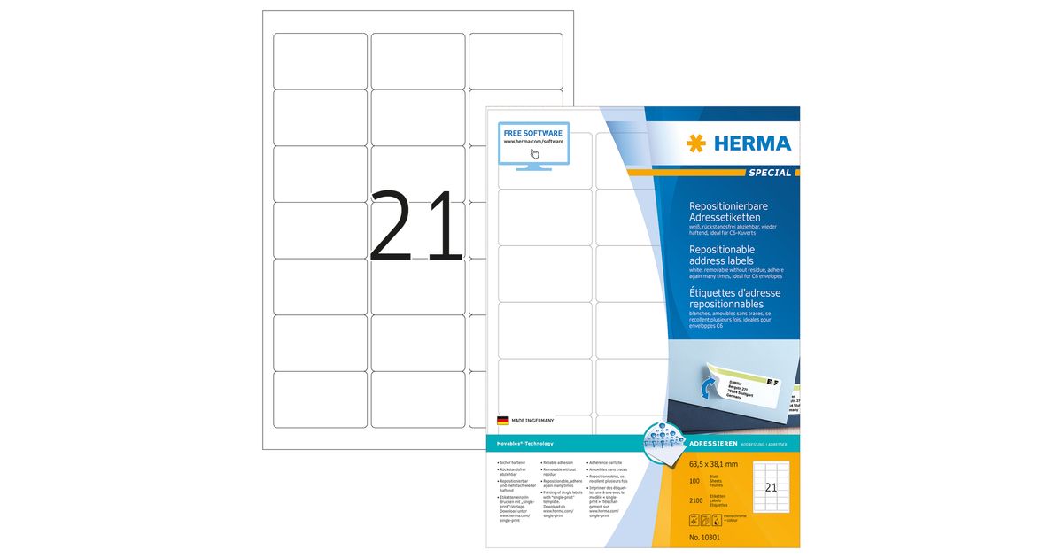HERMA Repositionable address labels A4 63.5x38.1 mm white Movables paper matt 2100 pcs., White, Paper, Laser/Inkjet, Matte, Removable, Rounded rectangle