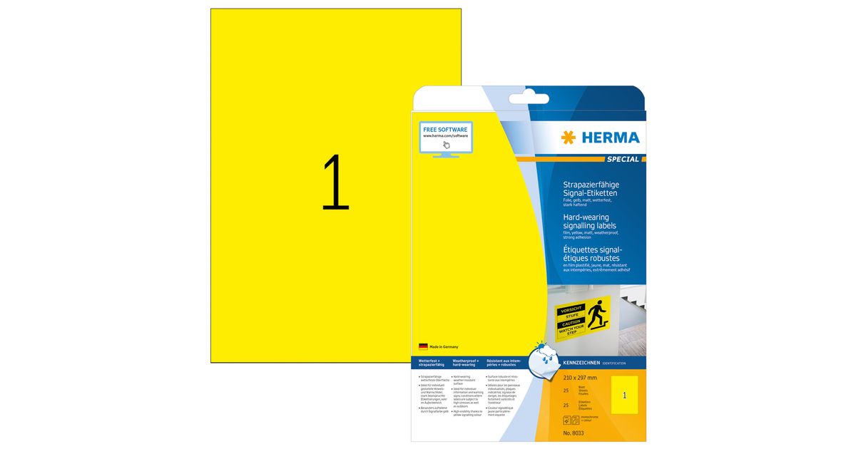 HERMA Signs signalling hard-wearing A4 210x297 mm yellow strong adhesion film matt weatherproof 25 pcs., Yellow, Self-adhesive printer label, A4, Laser, Permanent, Matte