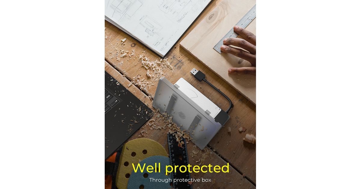 With the adapter and its matching protective plastic box, the SSD is also protected against shocks and dust when on the move. With the universal USB 3.2 Gen 1 Type-A connection, you can find a way to exchange data comfortably and quickly practically anywhere.