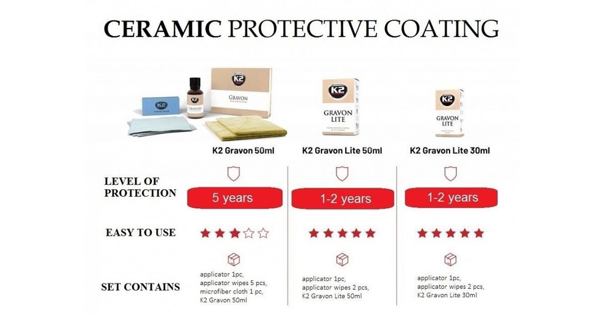 Keraamiline pinnakaitsevahend. mis kaitseb pinda kriimustuste. mustuse. UV-kiirguse. soolade. lindude väljaheidete. saasteainete. putukajääkide. korrosiooni ja mehaaniliste kahjustuste eest kuni 5 aastaks. Tänu keraamilisele pinnakattele ei ole vaja autot enam vahatada. Veelgi enam. tänu suurepärastele isepuhastuvatele omadustele tõrjub see efektiivselt mustust. mistõttu väheneb vajadus autot nii tihti pesta. Vastupidiselt vahadele ei ole keraamiline pinnakaitse kemikaalidega eemaldatav. Ainus viis katte eemaldamiseks on masinpoleerimine. Keraamiline pinnakate kaitseb efektiivselt pinda ka grafiti ja teiste värvikahjustuste eest. kuna värv ei kinnitu pinnale ja seda on kerge sealt eemaldada. K2 GRAVON sobib kasutamiseks ka teistel pindadel nagu kumm. plast. metall ja klaas. Keraamiline pinnakaitse on hetkel maailmas kõige tuntum ja vastupidavam pinnakaitsevahend. mis annab pinnale tunduvalt parema kaitse kui lakk. Pinnale moodustub 2-3 mikroni paksune keraamiline kiht. mis isoleerib pinna täielikult väliste mõjude eest.
