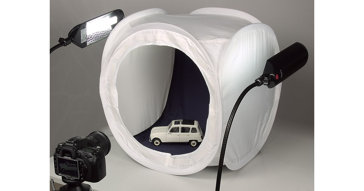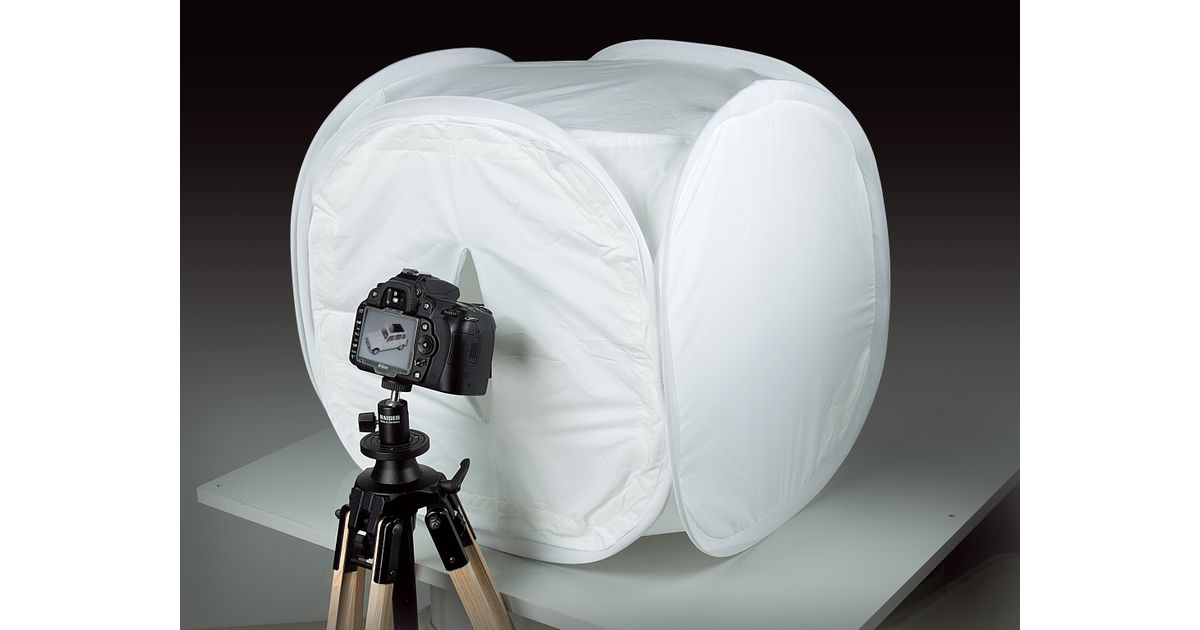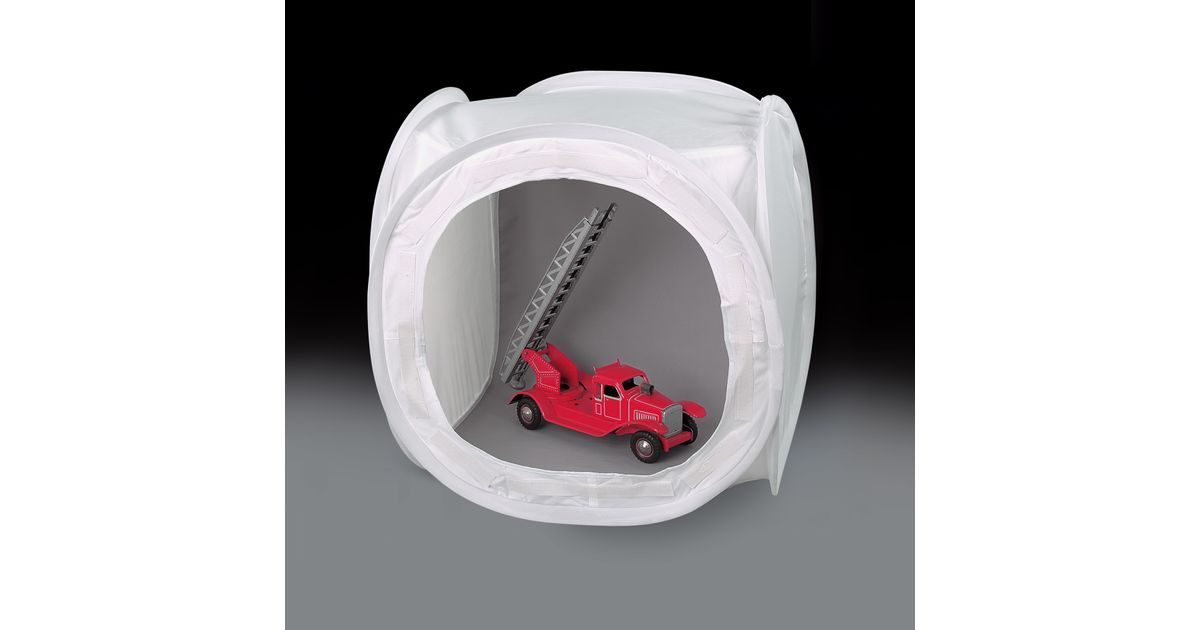 Cubical-shaped light tent for even and soft illumination of the subject. Detachable front cover with slot for camera lens. Easy to set up, folds up automatically. Highly flexible frame, can be folded down to compact