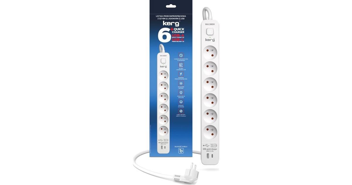KERG power strip with circuit breaker-6 sockets USBC+USBA 16A 3m