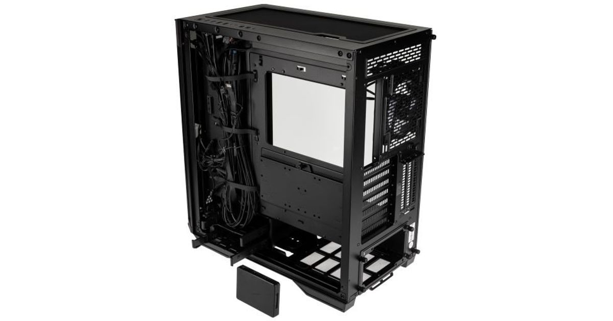As part of its innovative features, the PSU shroud opens from the rear panel for ease of access. This spacious shroud accommodates power supplies up to 200mm in length, as well as supporting a number of storage drives. In this area, you can install either two 2.5” SSDs or two 3.5” HDDs. Furthering your storage capacity, the back plate panel behind the motherboard can be removed and more storage can be installed here. This can host either three 2.5” SSDs or two 3.5” HDDs.