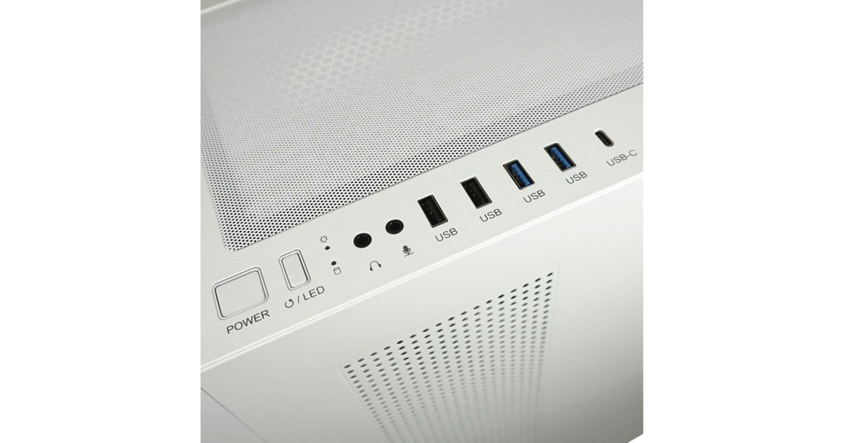 Das auf der Oberseite des Gehäuses eingearbeitete I/O-Panel enthält eine Power-, Farbwahl- & Resettaste sowie einen USB-C- und vier USB-A-Ports. Zusätzlich finden sich dort der HD-Audio Ein- und Ausgang, um entsprechende Audiogeräte ganz bequem nutzen zu können.