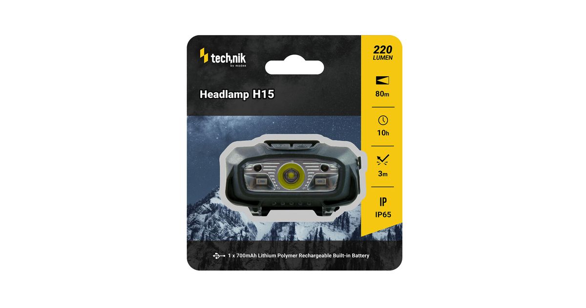 LED-pealamp Technik H15, 220lm, IP65, punase valgusega, USB-laetav