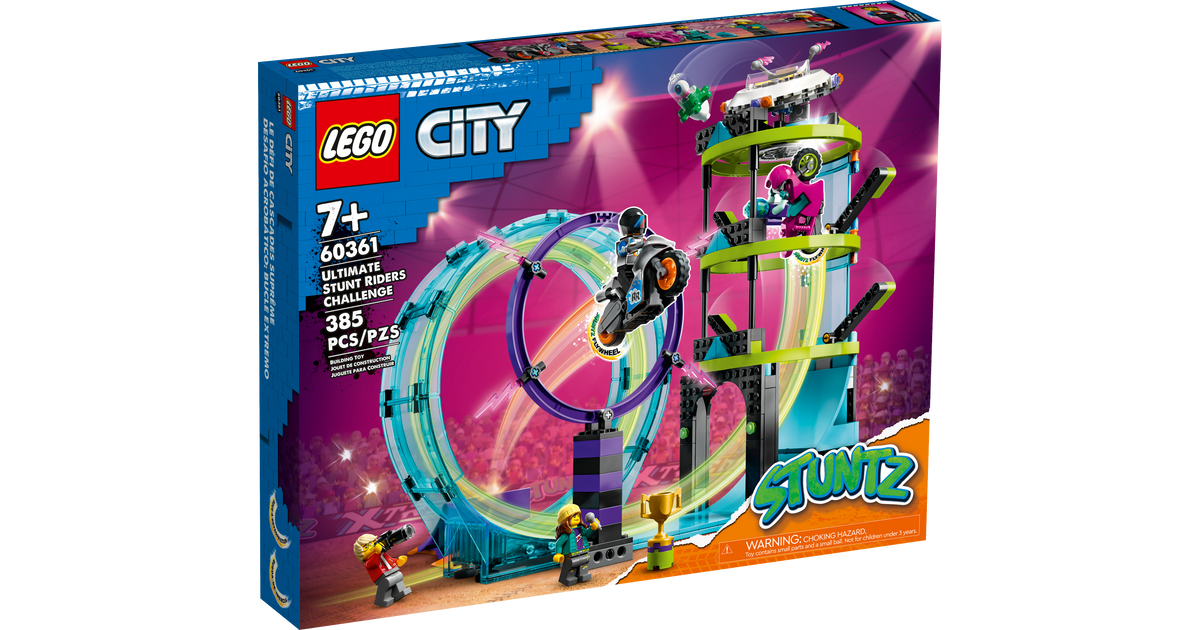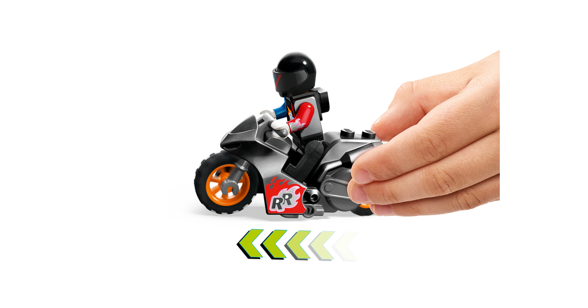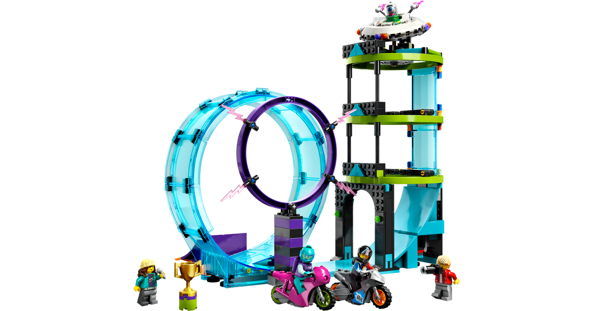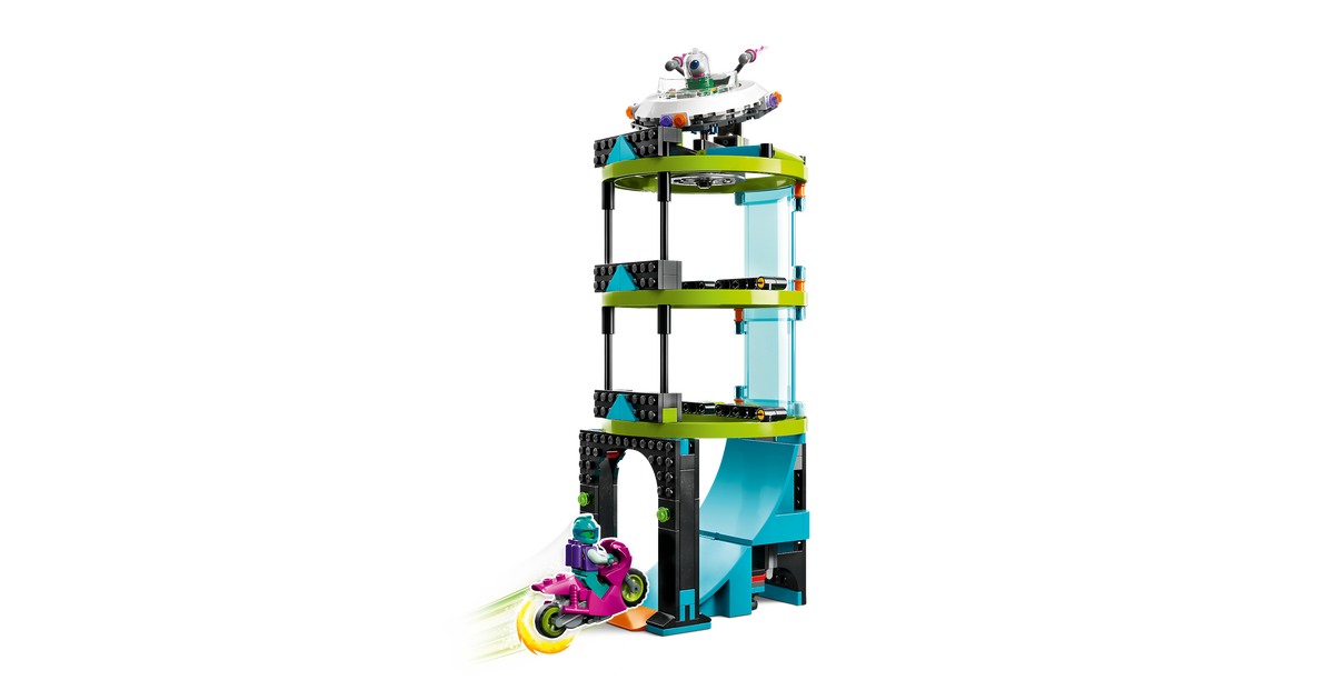 - Lõbus LEGO® City Stuntzi mäng – lapsed saavad sõita trikimootorrattaga mööda sõlme, hüpata läbi tulerõnga ja jõuda tulnukatorni tippu
