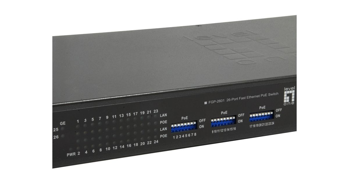 LevelOne 26-Port Fast Ethernet PoE Switch, 24 PoE Outputs, 2 x Gigabit RJ45, 150W, Unmanaged, Gigabit Ethernet (10/100/1000), Full duplex, Power over Ethernet (PoE), Rack mounting