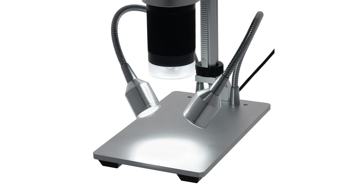 The lighting system is not an ordinary system. Several LEDs are located inside the objective – this is a standard upper lighting for observations in the reflected light. There are also two LED spotlights on flexible holders that can be bent at different angles so that you can more accurately align the lighting of the working area. The lighting brightness is adjustable.