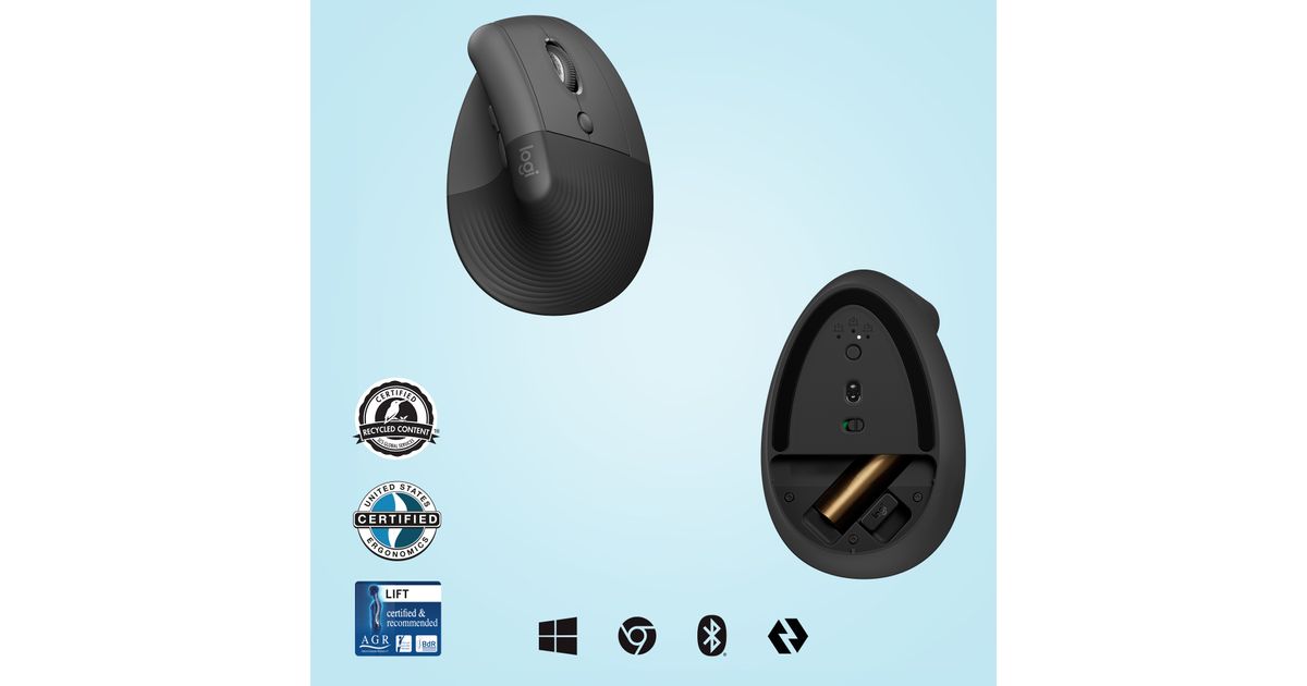 The plastic parts in Lift Vertical Ergonomic Mouse include certified post consumer recycled plastic — 70% for Graphite color and 54% for Rose and Off-White colors — to give a second life to end-of-life plastic from old consumer electronics and help reduce our carbon footprint.