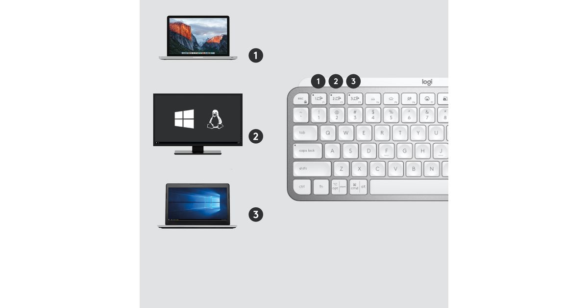 Sometimes one machine is enough—but not for busy creators. You can connect your MX Keys Mini for Business with up to three Windows®, macOS, Linux®, Chrome OS™, iPadOS, iOS or Android™ computers. Then seamlessly switch between them with the touch of an Easy-Switch™ key.