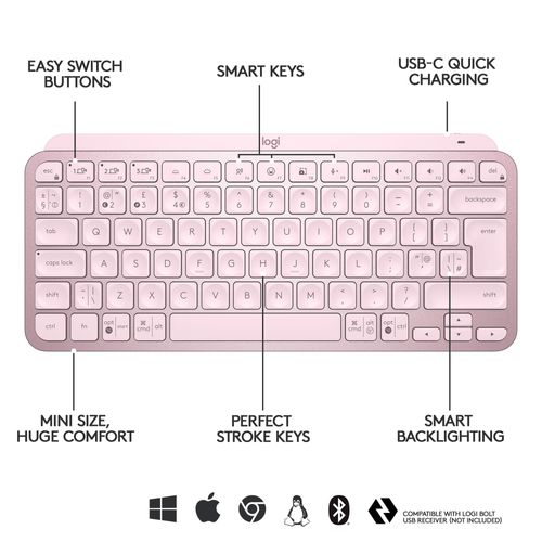 Logitech MX Keys Mini Minimalist Wireless Illuminated Keyboard, Mini, RF Wireless + Bluetooth, ĄŽERTY, LED, Pink