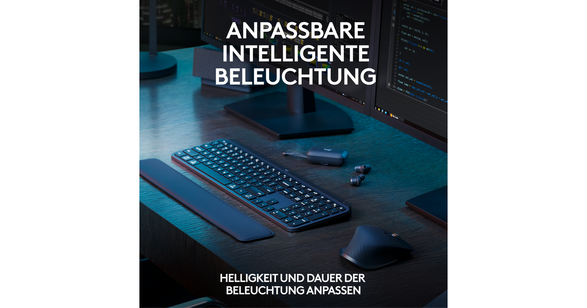 Backlit keys light up when your hands approach and automatically brighten or fade to suit your environment. Control backlighting duration and brightness in Logi Options+.