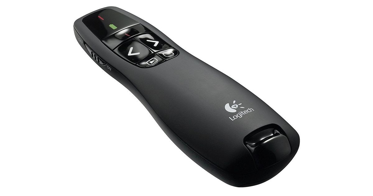 Logitech® Wireless Presenter R400 is designed to help you make your point. Its intuitive slideshow controls help you navigate through your presentation with confidence. Buttons are easy to find by touch. And its shape feels great in your hand. It’s got a red laser pointer that’s easy to see against most backgrounds and a range of up to 50 feet (15 meters), so you’ve got the freedom to move around the room and mingle with your audience. A storable plug-and-play wireless receiver makes it simple to get started—there’s no software to install. And when you’re through, the receiver stores inside the presenter to make packing up easy.