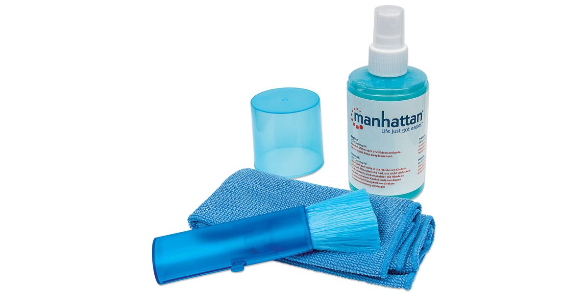 Manhattan LCD Cleaning Kit, Alcohol-free, Includes Cleaning Solution (200ml), Brush and Microfibre Cloth, Ideal for use on monitors/laptops/keyboards/etc, Three Year Warranty, Blister