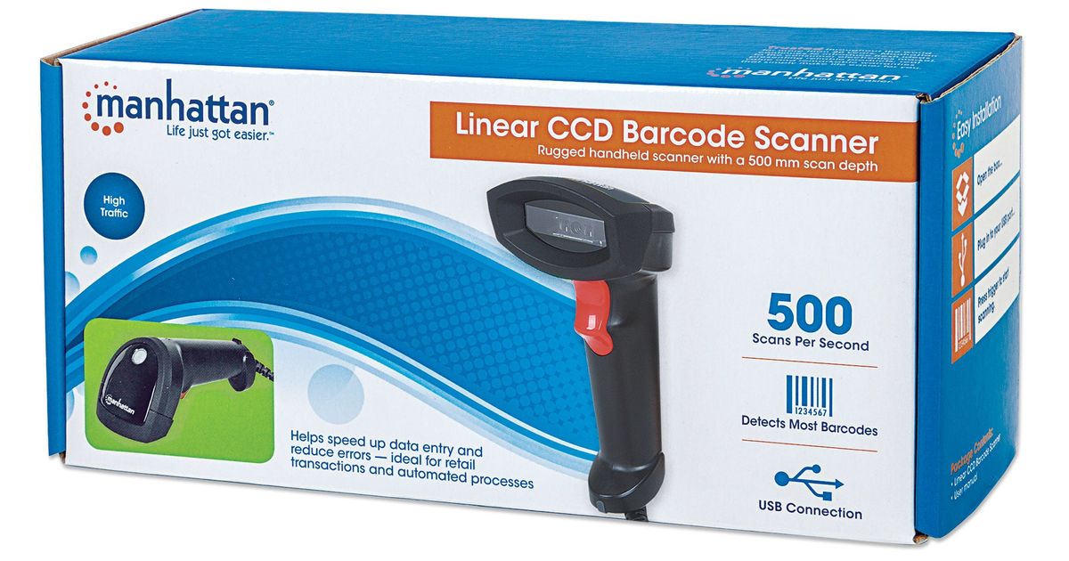 Manhattan Linear CCD Handheld Barcode Scanner, USB, 500mm Scan Depth, IP54 rating, Cable length 1.5m, Max Ambient Light 100,000 lux (sunlight), Black, Three Year Warranty, Box, Handheld bar code reader, 1D, CCD, Code 11, Code 128, Code 32, Code 39, Code 93, GS1-128 (UCC/EAN-128), JAN, 50 cm, 500 reads/s