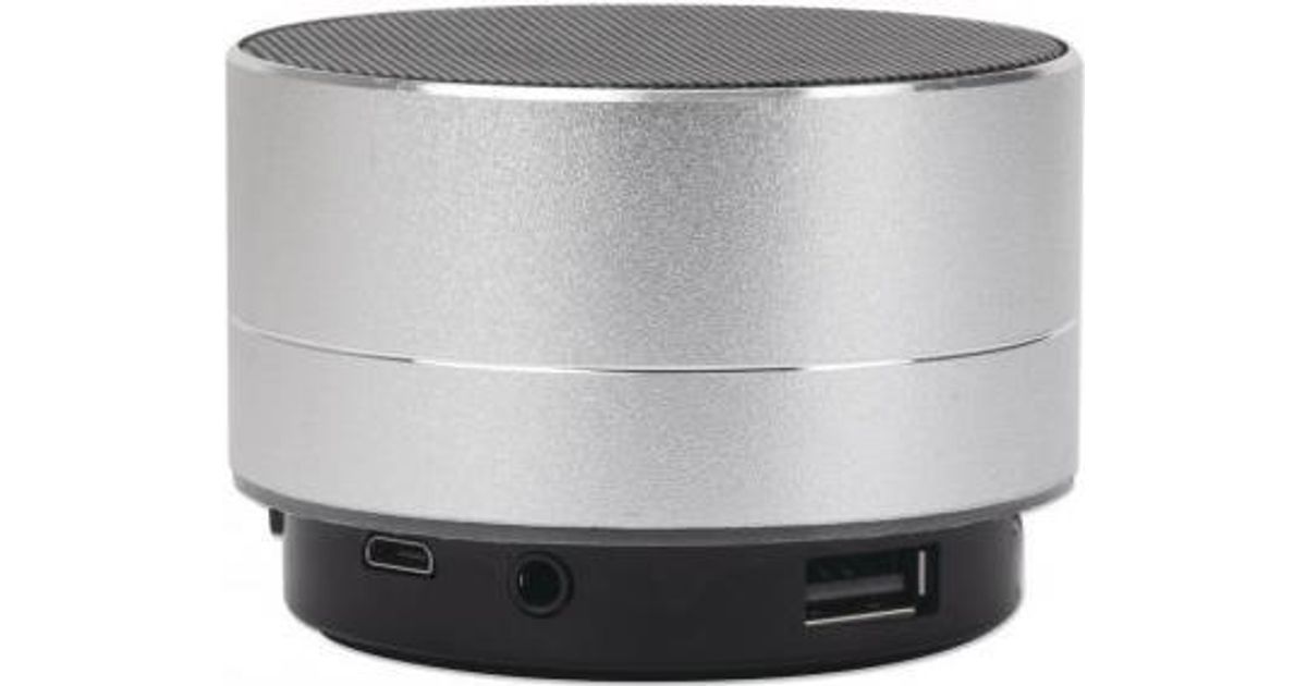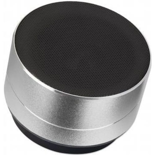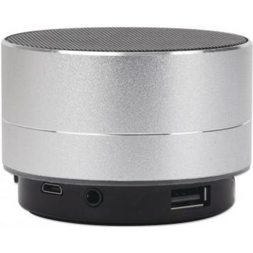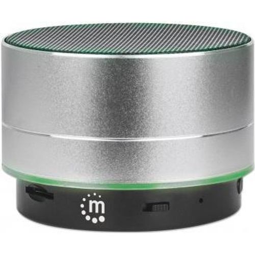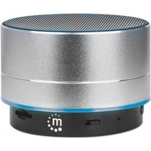 Manhattan Metallic Bluetooth Speaker (Clearance Pricing), Splashproof, Range 10m, microSD card reader, Aux 3.5mm connector, USB-A charging cable included (5V charging), Silver, Three Years Warranty
