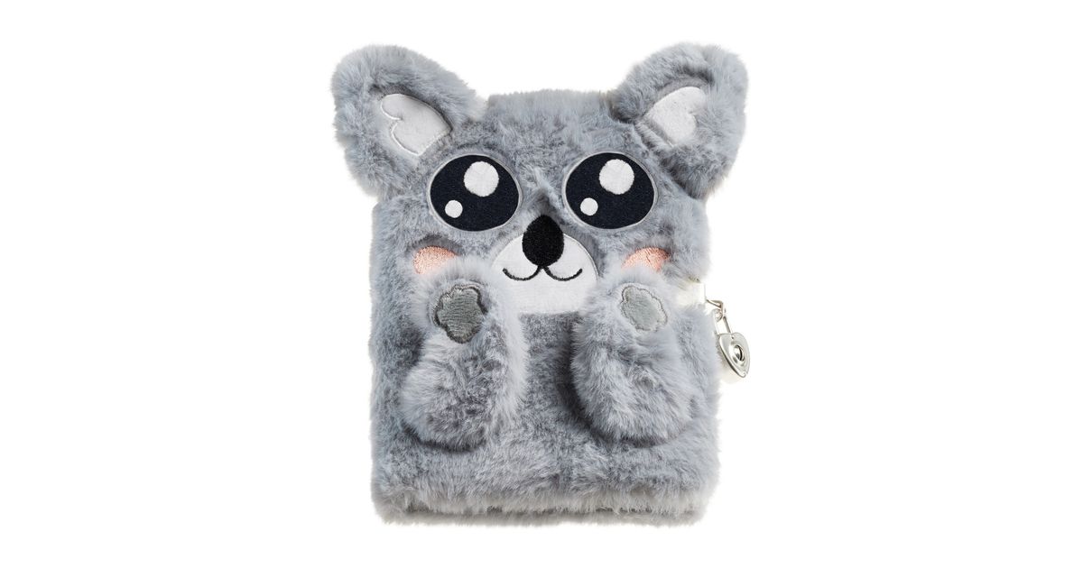 Koaalakujuline plüüsist päevik tõstetud kõrvade ja käppadega, tikitud näoga.