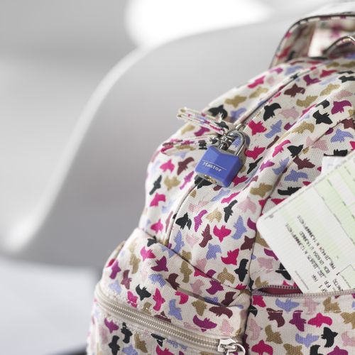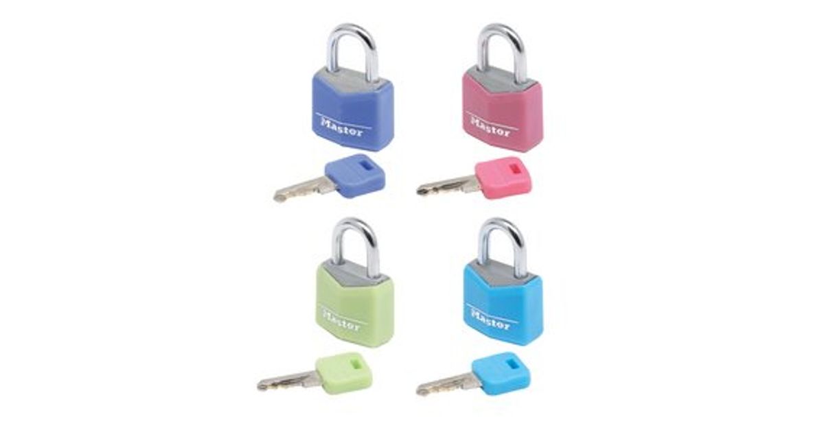 MASTER LOCK 20mm wide covered solid body padlock, assorted colours; 4-pack, Luggage key lock, Any brand, Aluminium, Blue, Green, Pink, Purple, Steel, Backpack, Briefcase, Duffel bag, Laptop bag, Luggage bag, Sport bag