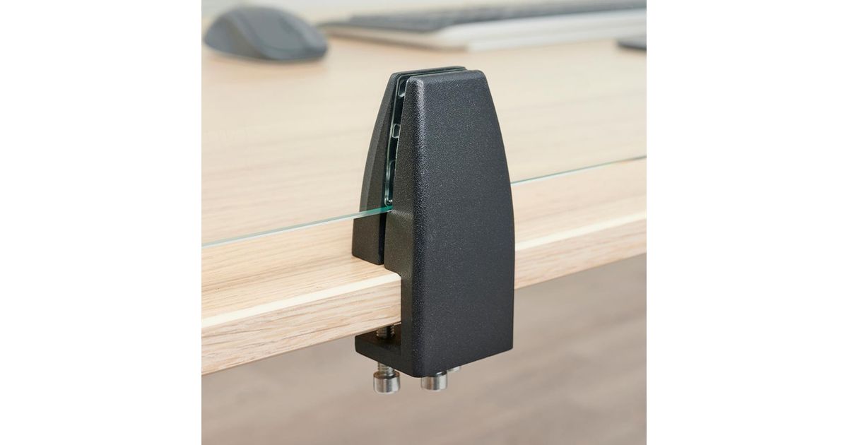 For desks with a table top thicker than 25 mm, the NS-CLMP40BLACK and NS-CLMP40WHITE clamps are available. With these clamps, the NS-GLSPROTECT140 can be mounted on desks with a work surface of 25-40 mm thick.