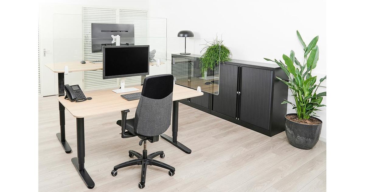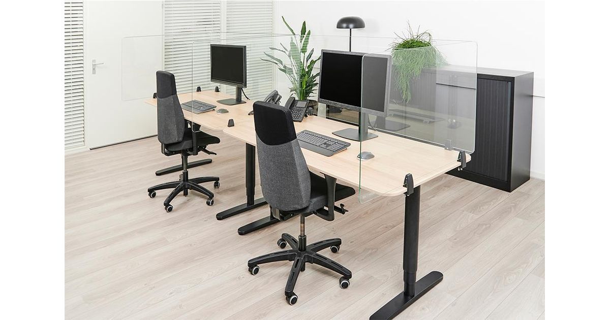 With the NS-GLSPROTECT, the workplace can be shielded from the front and side in a durable and stylish way, to create extra safety and distance from others. The series consists of 4 models with different sizes; the NS-GLSPROTECT100, NS-GLSPROTECT120, NS-GLSPROTECT140 and NS-GLSPROTECT160, for respectively 1 m, 1,2 m, 1,4 m and 1,6 m desks. All models are 65 cm high and 6 mm thick and made of laminated and tempered glass. The tempered glass adds an extra safety aspect to the screens; the transparent film between the two layers of glass increases the resistance and ensures that the glass stays in place and does not shatter, in the extreme case that the glass of the screen should break. The NS-GLSPROTECT models can be easily attached to the desk with two clamps and therefore move with the height-adjustable desk. The models can be used as desired for both the front and the sides of the desk, to create optimal safety. When mounted to the side of an average desk, the screen protrudes beyond the desk, automatically creating a barrier between the user and any person at the desk next to it. The NS-GLSPROTECT products are 100% recyclable, very user-friendly, easy to install and easy to clean.