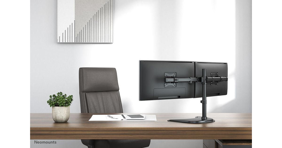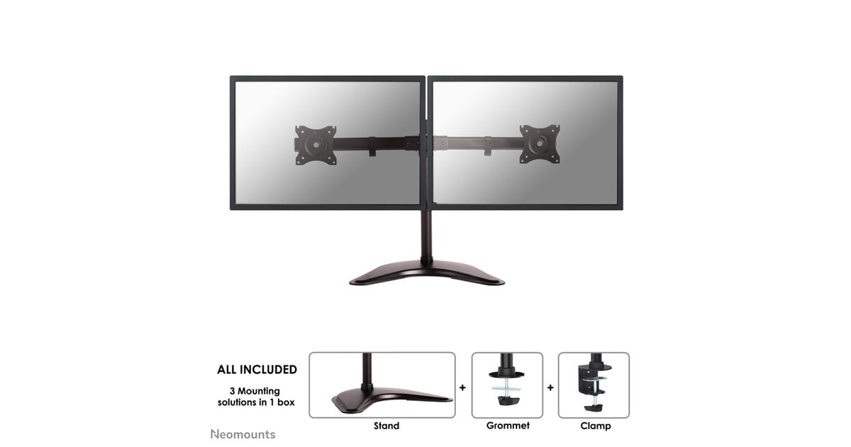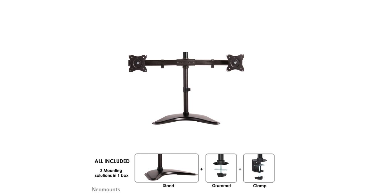 The Neomounts Select desk mount, model NM-D335DBLACK is a tilt-, swivel and rotatable desk mount for 2 flat screens up to 27". This mount is a great choice for space saving placement on desks using a desk clamp, desk stand or desk grommet.