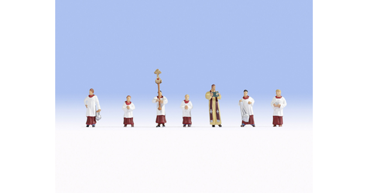 »Country Delights are Just so in Vogue! With this year’s NOCH Focus Theme »Country Delights«, we are pleased to offer you a lot of new and very attractive figures. The Figures Set »Priest and Altar Servers« contains six Altar Servers and one Priest, which are all in scale 1:87 (scale H0) and hand-painted. On every model railway layout a scene with a church can be shown. Matching this, there is now a priest who holds the mass. Also his »assistants«, the altar servers are not forgotten. They wear the typical gown, consisting of a red skirt, white gown and collar. One altar boy holds a large cross and also the censer is used in the many masses. The priest wears a liturgical garment and matching stole around his neck while holding the mass. An altar boy (from the latin »ministrare« - to serve) or server is a liturgical assistant in the Roman Catholic Church. The Codex luris Canonici dated 1917 requested in Can. 813 that the presence of a altar boy was compulsory in the celebration of the Holy Mass (source: Wikipedia).