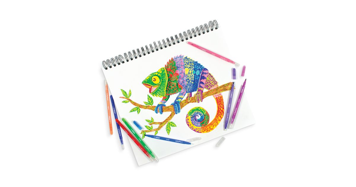 This set of twelve color markers comes with chiseled tips for both thick and thin strokes. Color boldly and then change it up in a different way each time. Just use any of the white ends to draw or color over your colored in area. Make mystery color change designs or turn your entire piece of art on its head by changing everything. Watch wonder unfold as you create a new masterpiece with these one of a kind color markers.