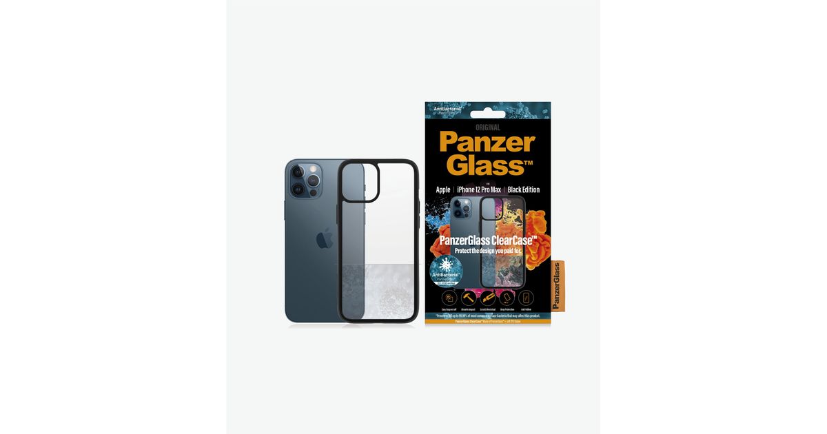 PanzerGlass™ ClearCase™ Black Edition til Apple iPhone 12 Pro Max is the strongest ClearCase™ from PanzerGlass™ and protects the beautiful design you paid for. ClearCase™ Black Edition protects the phone from drops, scratches and dust. Produced with PanzerGlass™ and an extra strong honeycomb frame. The case matches all buttons etc for easy and full access to all functionalities. Slightly swelling bumpers in all corners to enhance protection. Applying a ClearCase™ Black Edition does not affect wirelesscharging.