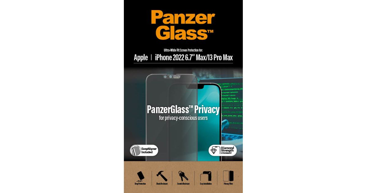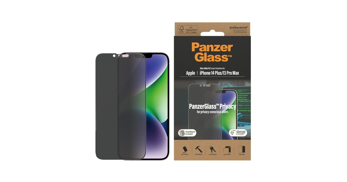 PanzerGlass ™ Privacy Screen Protector Apple iPhone 14 Plus | 13 Pro Max | Ultra-Wide Fit w. EasyAligner, Apple, Apple - iPhone 14 Plus, Apple - iPhone 13 Pro Max, Dry application, Scratch resistant, Shock resistant, Anti-bacterial, Transparent, 1 pc(s)