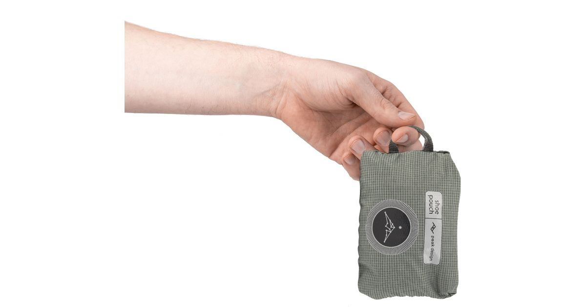 Strong, ultralight, and ultra-packable, Shoe Pouch provides basic storage for shoes or clothes. Works great with any suitcase or bag, and sized to fit perfectly into any bag in the Peak Design Travel Line. Uniquely patterned from a single piece of self-healing 70D nylon, the Shoe Pouch weighs in at a feathery 48 g. When you’re not using Shoe Pouch, stow it in the integrated storage pouch. A perfect little bag to have on-hand in case you need more storage or organization mid-trip. Typically fits 1-2 pairs of shoes, depending on size.